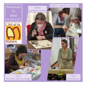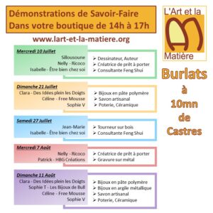 Pendant tout l’été, les créateurs et artisans de l’Art et la Matière vous proposent de découvrir leur savoir-faire au cours d’après midi de démonstrations.